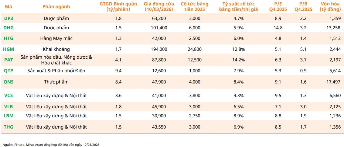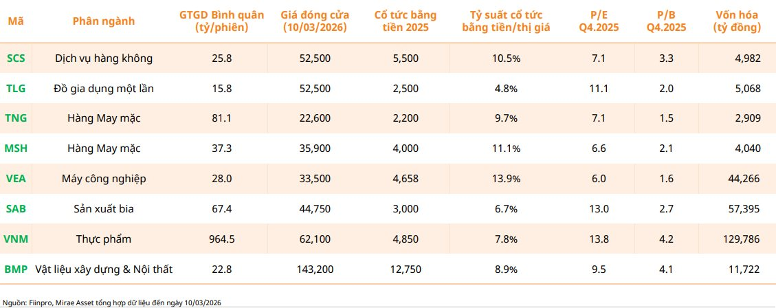 Theo báo cáo của Mirae Asset Securities, danh mục cổ phiếu thanh khoản cao được lựa chọn từ các doanh nghiệp có nền tảng tài chính vững chắc, dòng tiền ổn định và duy trì chính sách chi trả cổ tức tiền mặt hấp dẫn. Các cổ phiếu trong danh mục đều có thanh khoản tối thiểu khoảng 10 tỷ đồng mỗi phiên và mức định giá P/E tương đối thấp, phù hợp với chiến lược đầu tư giá trị.