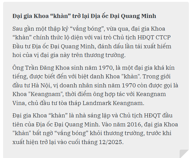 Được biết, CTCP Đầu tư Địa ốc Đại Quang Minh được thành lập vào tháng 3/2011 với vốn điều lệ 4.200 tỷ đồng. Hoạt động chính trong lĩnh vực kinh doanh bất động sản. Hiện, người đại diện pháp luật của doanh nghiệp là Tổng Giám đốc Nguyễn Hoàng Tuệ.