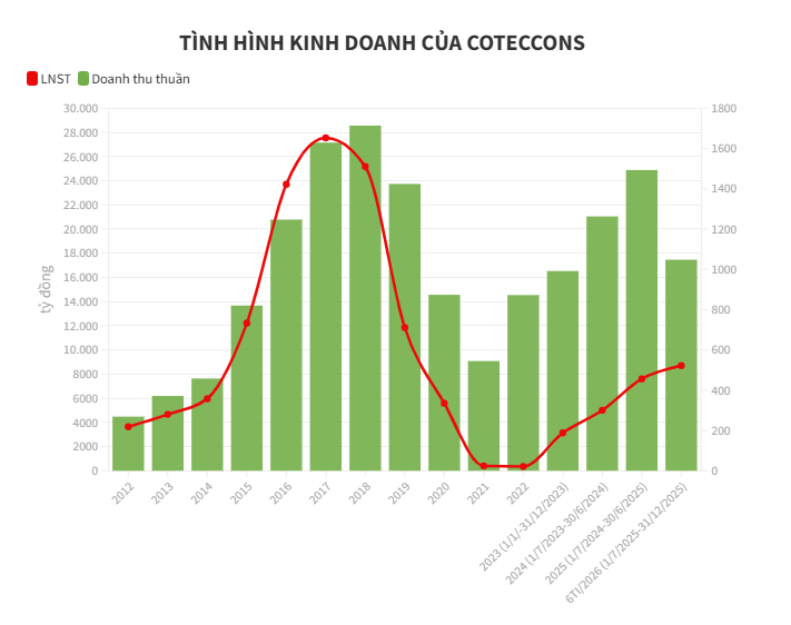 Tính chung 6 tháng đầu năm tài chính 2026 ((1/7/2025-31/12/2025), doanh thu thuần của Coteccons đạt 17.459 tỷ đồng, tăng khoảng 50% so với cùng kỳ. Lợi nhuận sau thuế lũy kế đạt 522 tỷ đồng, tăng trưởng 165%.