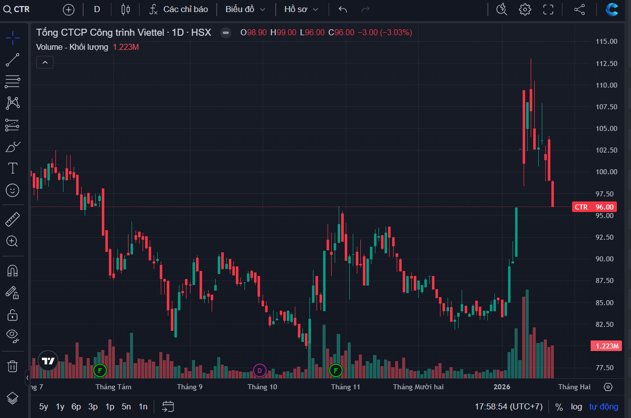 Trên thị trường chứng khoán, kết phiên giao dịch ngày 23/1/2026, cổ phiếu CTR đóng cửa ở mức 96.000 đồng/cổ phiếu, giảm 3% so với kết phiên ngày 22/1.