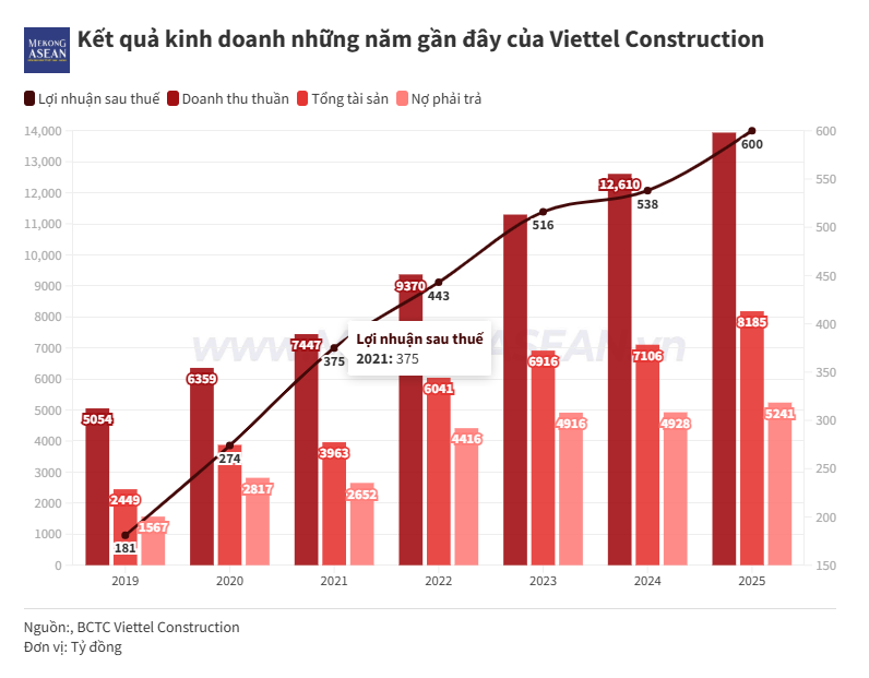 Năm 2025, Viettel Construction đạt doanh thu hơn 13.939 tỷ đồng và lãi sau thuế gần 600 tỷ đồng, đều ở mức cao nhất từ trước đến nay.