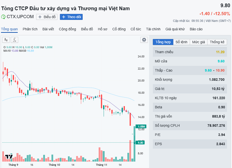 Chốt phiên ngày 24/11, cổ phiếu CTX của Tổng CTCP Đầu tư Xây dựng và Thương mại Việt Nam – CTX Holdings tiếp tục giảm sàn 15% xuống 11.200 đồng/cp, phiên thứ 2 liên tiếp giảm sàn với dư bán sàn hơn 1,1 triệu đơn vị, trong khi khối lượng giao dịch chỉ hơn 87.000 đơn vị.
