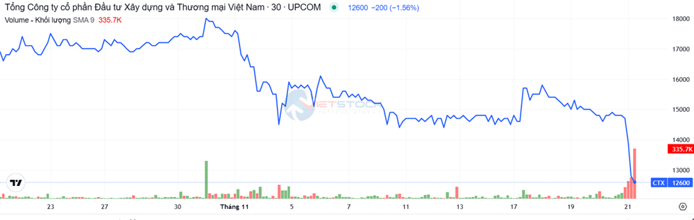Trước quyết định bất ngờ này của HĐQT, cổ phiếu CTX giảm sàn xuống 12.600 đồng/cp phiên 21/11. Trước đó, cổ phiếu này đã có chuỗi giảm giá mạnh từ vùng 20.800 đồng/cp xuống 12.600 đồng/cp, tức giảm gần 40% trong 3 tháng qua.