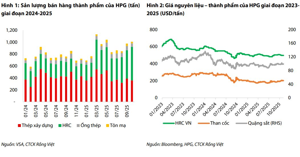 Trước đó trong quý 3/2025, HPG ghi nhận doanh thu 36.400 tỷ đồng (-2% so với cùng kỳ), với sản lượng tiêu thụ 2,4 triệu tấn (+26% so với cùng kỳ), trong đó: