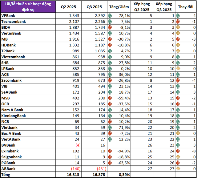 Theo số liệu từ 27 ngân hàng trên sàn chứng khoán, tổng lãi thuần từ hoạt động dịch vụ của 27 ngân hàng đạt 16.878 tỷ đồng, tăng nhẹ 0,39% so với quý 2/2025. Dù quy mô toàn ngành gần như đi ngang, bảng xếp hạng ghi nhận nhiều biến động lớn ở nhóm đầu và giữa.