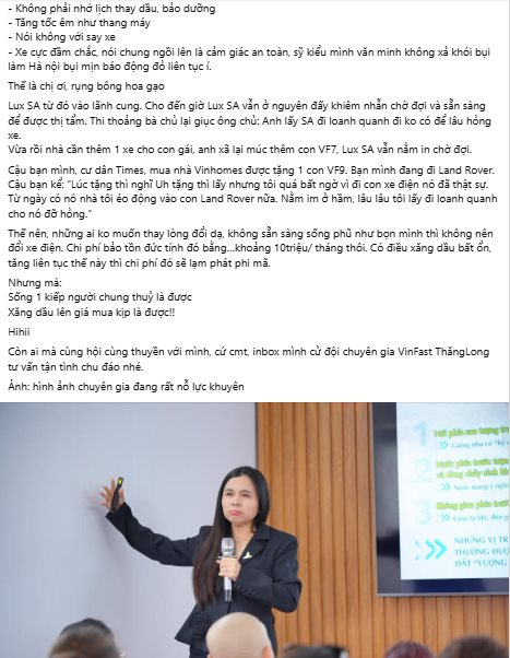 Cũng trong bài chia sẻ, bà Trâm nhắc tới câu chuyện của một người bạn đang sử dụng xe của thương hiệu Land Rover. Người này cho biết sau khi được tặng một chiếc VinFast VF 9 khi mua nhà, gia đình đã bất ngờ trước trải nghiệm xe điện và sử dụng chiếc xe này thường xuyên hơn, trong khi chiếc xe xăng cũ phần lớn thời gian nằm trong hầm.