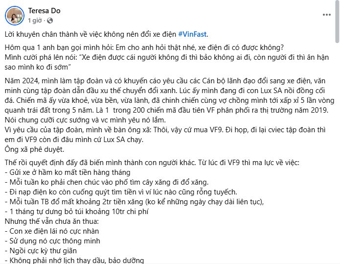 Dù tiêu đề bài viết được bà Trâm đặt theo cách hài hước là “lời khuyên chân thành về việc không nên đổi xe điện”, nội dung thực tế lại mang thông điệp ngược lại. Theo bà, nhiều người sau khi chuyển sang xe điện thường thay đổi thói quen sử dụng xe, đặc biệt khi nhận thấy chi phí vận hành thấp hơn và trải nghiệm lái khác biệt.