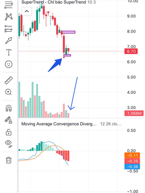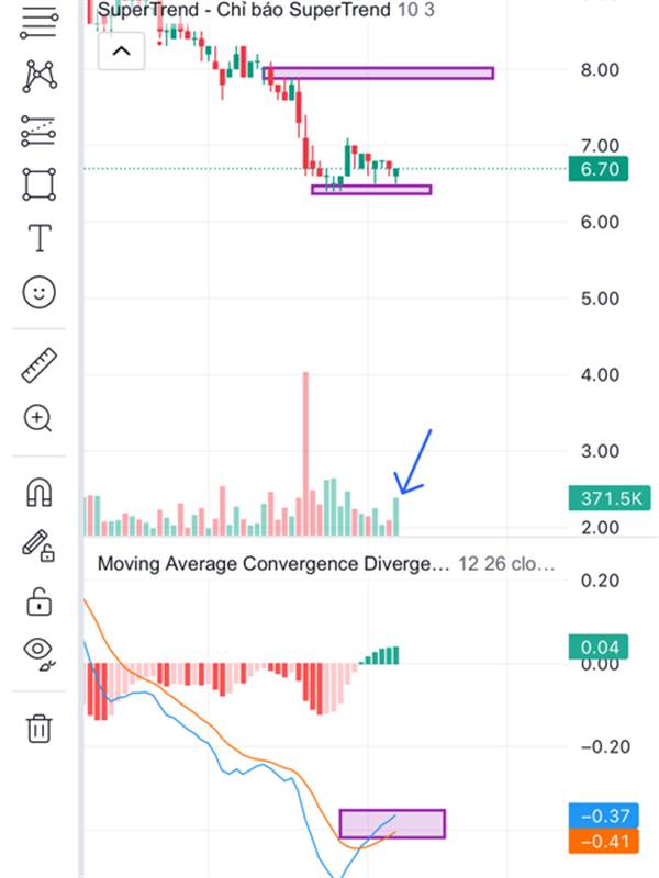 vol ngày mua vào đã có, trợ giá cũng xuất hiện vùng 6.7. đóng nến tuần ở vùng supertrend giảm neo giá 6.7. h chỉ còn đợi vol