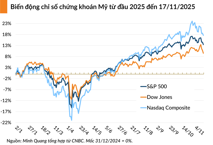 Dù vậy, các chuyên gia cũng nhấn mạnh thị trường chứng khoán Mỹ vẫn duy trì xu hướng tăng đáng kể trong năm 2025. S&P 500 tăng hơn 13% từ đầu năm, trong khi Nasdaq tăng gần 17%. Một số tổ chức lớn như Morgan Stanley thậm chí nâng mục tiêu của S&P 500 lên 7.800 điểm trong năm 2026, cho thấy kỳ vọng dài hạn vẫn tích cực.