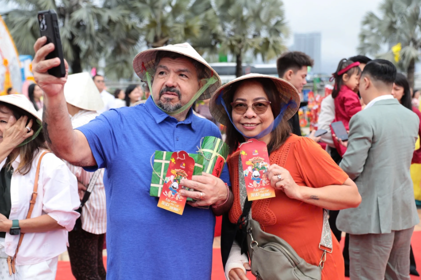 Tại khu vực công viên phía Nam - bờ Tây cầu Rồng, ngành Du lịch tổ chức đón đoàn khách đầu năm với hoạt động múa lân, tặng quà, hái lộc, trải nghiệm văn hóa Tết. Không khí rộn ràng tiếp tục tại Cảng hàng không quốc tế Đà Nẵng khi chuyến bay quốc tế đầu tiên hạ cánh trong ngày đầu năm được chào đón bằng hoa tươi, quà lưu niệm và các tiết mục nghệ thuật truyền thống.