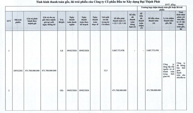 Cụ thể, ngày 9/2/2026, Đại Thịnh Phát phải thanh toán hơn 5 tỷ đồng tiền lãi và 471,7 tỷ đồng tiền gốc lô trái phiếu DPJ12202.