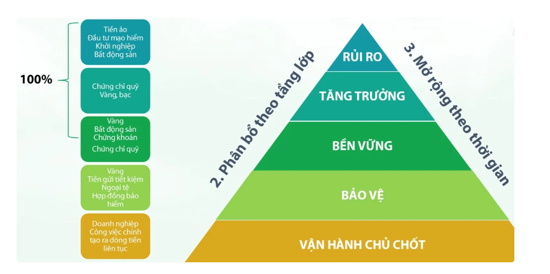 Cụ thể hóa, bà Đặng Thị Lan Hương - Tổng Giám đốc CTCP Quản lý quỹ Rồng Việt giới thiệu mô hình “tháp tài sản” như một công cụ thực tiễn cho các gia đình. Theo đó, nền tảng của tháp là công việc chính hoặc doanh nghiệp tạo ra dòng tiền ổn định. Phía trên là các lớp tài sản mang tính bảo vệ như tiền gửi, bảo hiểm; tiếp đến là các tài sản tăng trưởng như chứng khoán, bất động sản; và trên cùng là các tài sản rủi ro cao như đầu tư mạo hiểm hay tiền mã hóa.