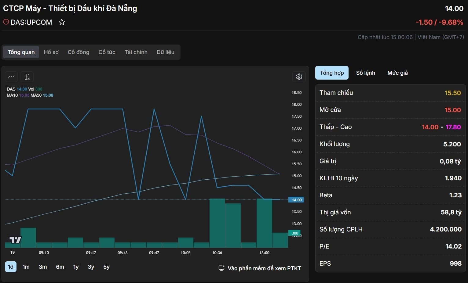 Từ 12-18/11, cổ phiếu của CTCP Máy - Thiết bị Dầu khí Đà Nẵng (Daesco, UPCoM: DAS) đã có 5 phiên tăng trần liên tiếp. Thị giá bật từ 8,500 đồng/cp lên 15,500 đồng/cp.