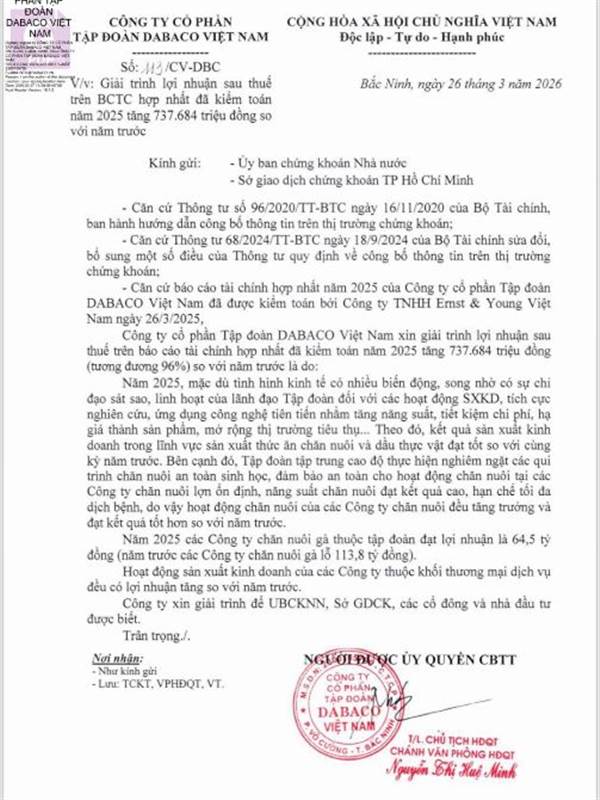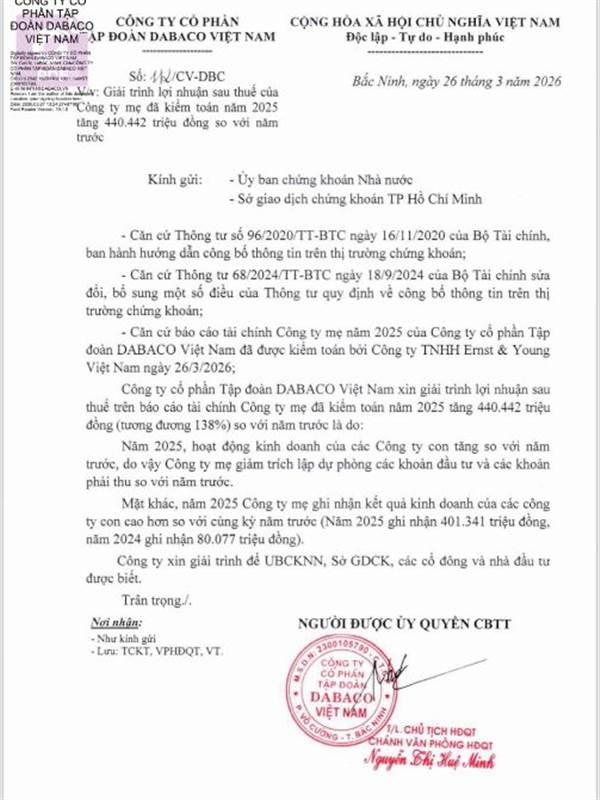 Công ty Cổ phần Tập đoàn DABACO Việt Nam thông báo giải trình biến động LNST trên BCTC kiểm toán năm 2025 so với cùng kỳ năm trước như sau: