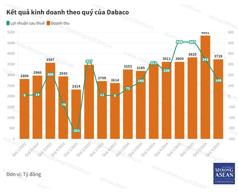 Chỉ số lãi sau thuế quý 4/2025 của Dabaco rơi xuống mức thấp nhất trong 6 quý gần đây. Tuy nhiên tính chung cả năm, công ty vẫn lập kỷ lục lợi nhuận năm với hơn 1.500 tỷ đồng.