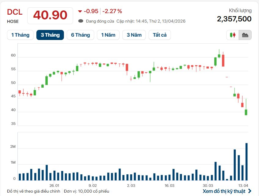 Kết phiên 13/4, giá cổ phiếu DCL ở mức 40.900 đồng/cổ phiếu, giảm 2,27% so với phiên trước, khối lượng cổ phiếu giao dịch khớp lệnh đạt gần 2,4 triệu đơn vị.