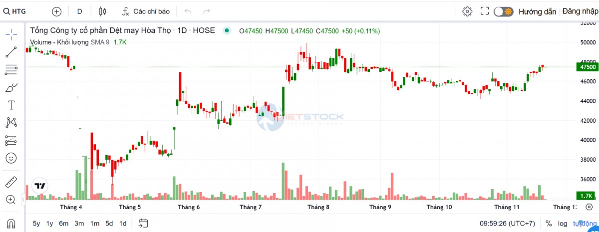 Trên thị trường chứng khoán, chốt phiên giao dịch ngày 19/11, cổ phiếu HTG giảm nhẹ xuống 47.450 đồng, mất 50 đồng tương đương 0,11% so với phiên 18/11, nhưng thanh khoản lại tăng mạnh với hơn 23.000 cổ phiếu được khớp lệnh, cao hơn rất nhiều so với mức 1.700 cổ phiếu của phiên liền trước.