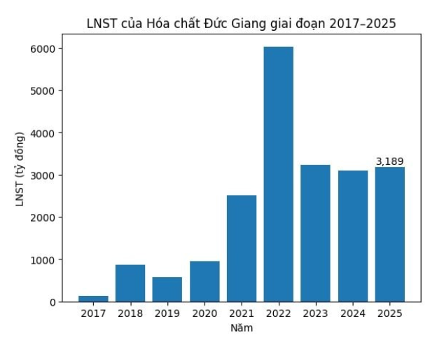 Lũy kế cả năm 2025, Hóa chất Đức Giang ghi nhận doanh thu thuần hợp nhất đạt 11.262 tỷ đồng, tăng 14% so với năm trước. Lợi nhuận sau thuế đạt 3.189 tỷ đồng, tăng nhẹ 3% so với năm 2024. Lãi cơ bản trên mỗi cổ phiếu (EPS) đạt 7.487 đồng, nhích nhẹ so với cùng kỳ.