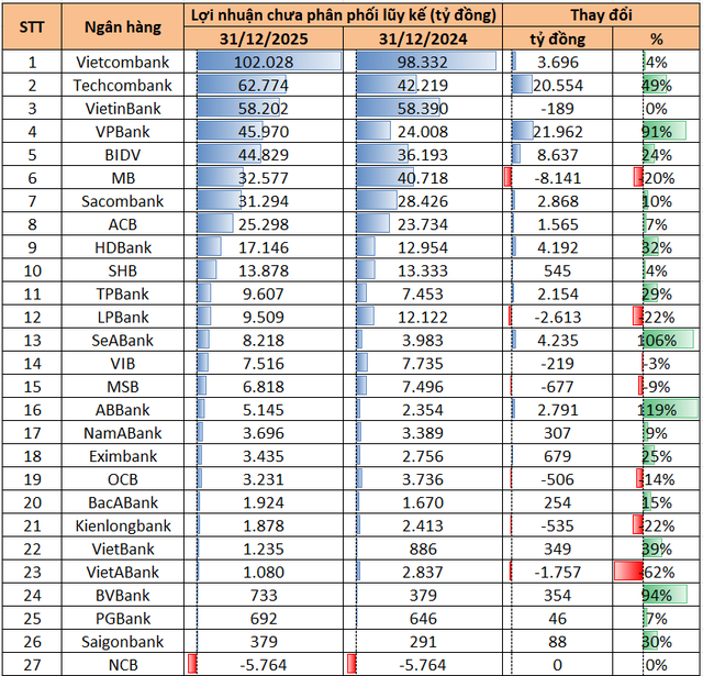 Dẫn đầu hệ thống về lợi nhuận chưa phân phối là Vietcombank với 102.028 tỷ đồng tại thời điểm 31/12/2025, tăng thêm 3.696 tỷ đồng so với cuối năm trước. Đây cũng là ngân hàng duy nhất trong hệ thống có khoản lợi nhuận tích lũy vượt mốc 100.000 tỷ đồng, phản ánh hiệu quả kinh doanh ổn định và khả năng sinh lời cao trong nhiều năm liên tiếp.