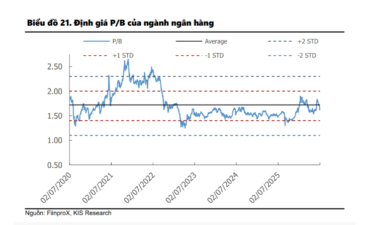 Sự điều chỉnh của giá cổ phiếu kèm kết quả kinh doanh tăng trưởng tốt năm 2025, nhóm ngân hàng đã được tái định giá lại. Theo nhiều đơn vị phân tích, P/B (giá trên giá trị sổ sách) của nhóm ngân hàng đã về mức rất hấp dẫn so với bình quân 5 năm.