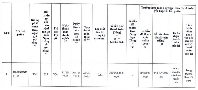 Được biết lô trái phiếu mã DLGBOND14.19 gồm 366 trái phiếu có mệnh giá 1 tỷ đồng/trái phiếu, tổng giá trị phát hành 366 tỷ đồng, được phát hành từ ngày 31/12/2014, kỳ hạn 5 năm.