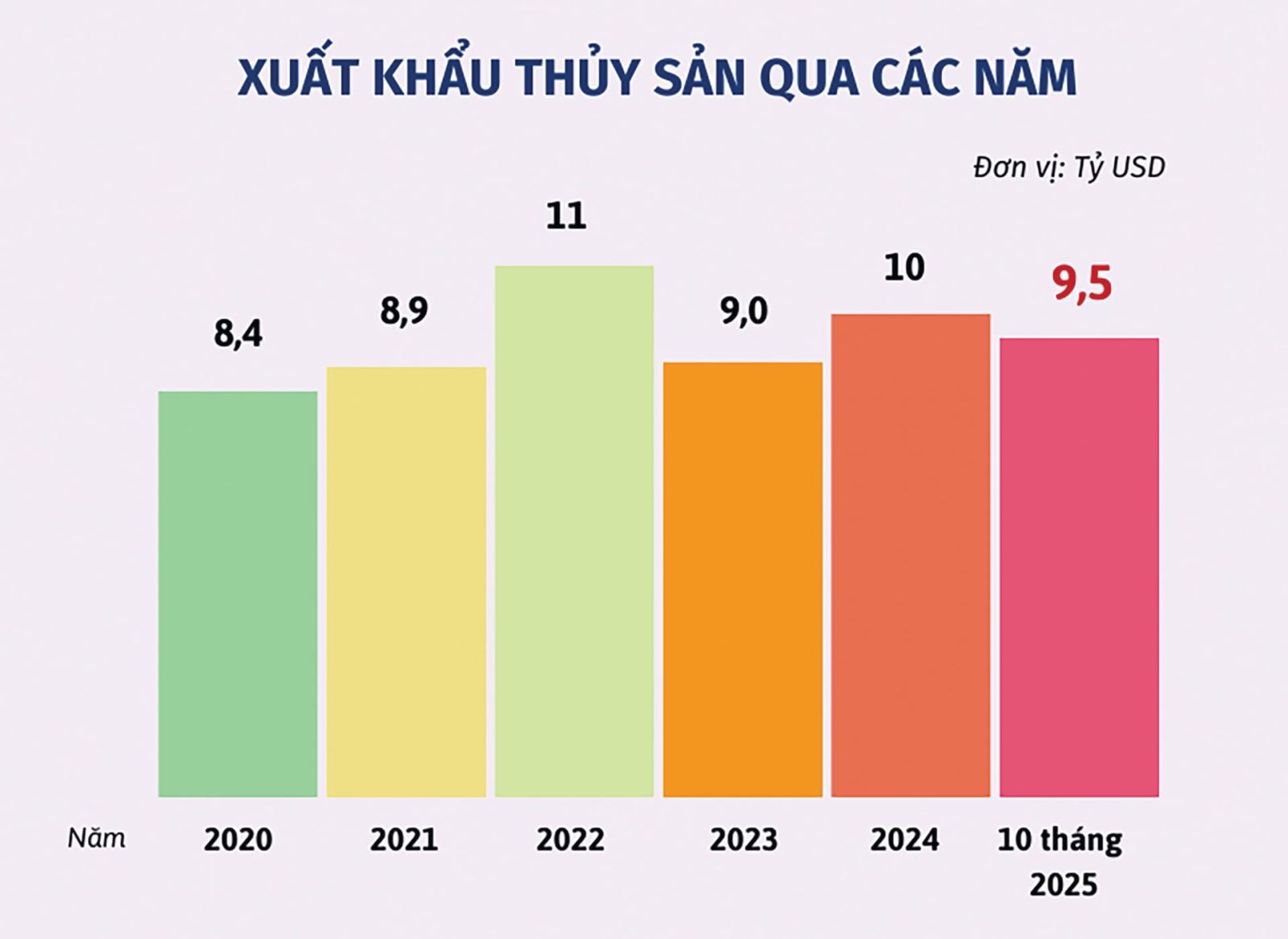 Xuất khẩu thủy sản Việt Nam đạt 9,5 tỷ USD trong 10 tháng đầu năm nay, tăng 16% so với cùng kỳ 2024. Nguồn: VASEP