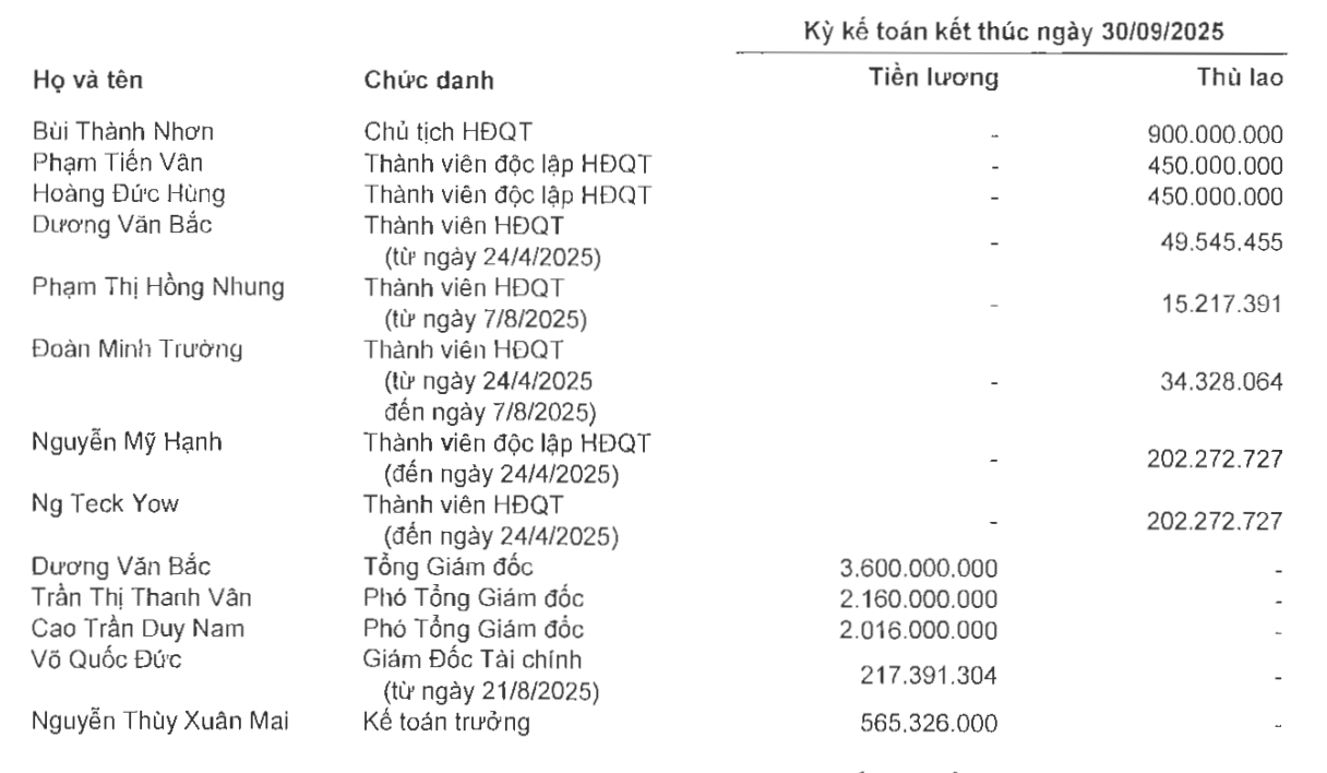 Người đứng đầu HĐQT, ông Nguyễn Văn Đạt, nhận gần 547 triệu đồng, cao hơn khoảng 13% so với mức xấp xỉ 485 triệu đồng cùng kỳ 2024. Con trai ông Đạt là ông Nguyễn Tấn Danh, Phó Chủ tịch HĐQT chứng kiến mức tăng mạnh hơn, từ 150 triệu đồng lên 270 triệu đồng.