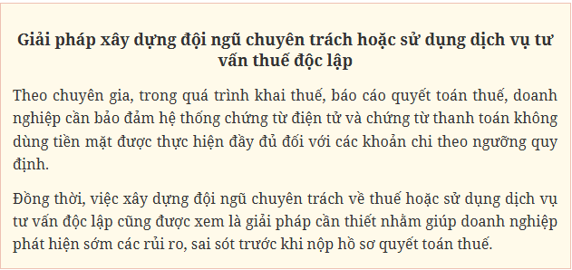 “Ngay từ bây giờ, các doanh nghiệp cần chủ động rà soát hồ sơ kế toán - thuế, có thể thông qua các dịch vụ kế toán, kiểm toán, tư vấn thuế chuyên nghiệp để “tầm soát” hồ sơ khai thuế, báo cáo quyết toán thuế của doanh nghiệp mình. Nhất là đối với các doanh nghiệp FDI, các tập đoàn đa quốc gia, sự chuẩn bị này càng phải làm sớm hơn nữa để đáp ứng các yêu cầu về tiến độ, thời gian rà soát, đối chiếu hồ sơ thuế trên toàn cầu, nhằm chuẩn bị hồ sơ quyết toán thuế năm 2025 một cách chủ động, mang tính chiến lược trong quản trị rủi ro về thuế - kế toán hơn là tìm cách đối phó, chạy theo xử lý những tình huống sai sót không đáng có…”.