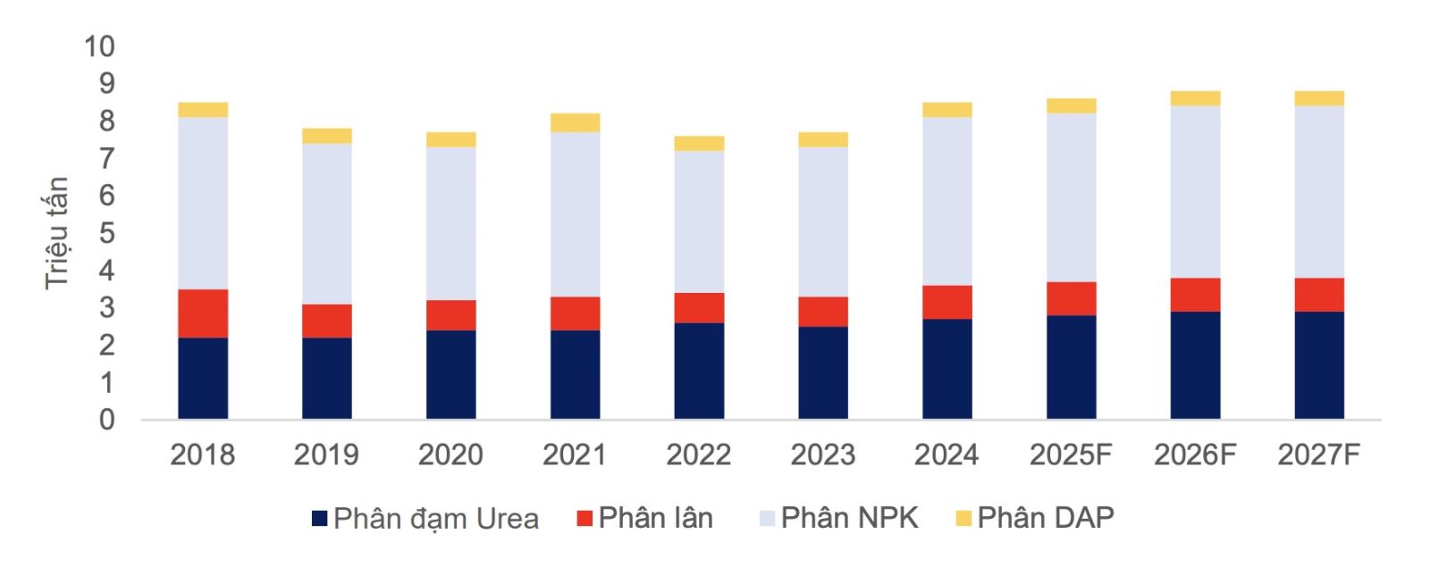 MBS ước tính sản lượng tiêu thụ phân bón nội địa năm 2026 tăng trưởng nhẹ ở mức 2% và đạt 10,7 triệu tấn. Xuất khẩu tiếp tục khả quan nhờ giá phân bón quốc tế ổn định và nhu cầu từ Ấn Độ, Brazil, với sản lượng xuất khẩu ước đạt 1,8 triệu tấn và chiếm 14,3% sản lượng nội địa.