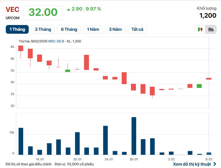 Thông tin về việc mở rộng hoạt động đầu tư diễn ra trong bối cảnh cổ phiếu VEC ghi nhận diễn biến tích cực trên thị trường UPCoM. Kết thúc phiên giao dịch sáng ngày 09/02/2026, thị giá VEC đạt 32.000 đồng/cổ phiếu, tăng 9,97% so với tham chiếu.