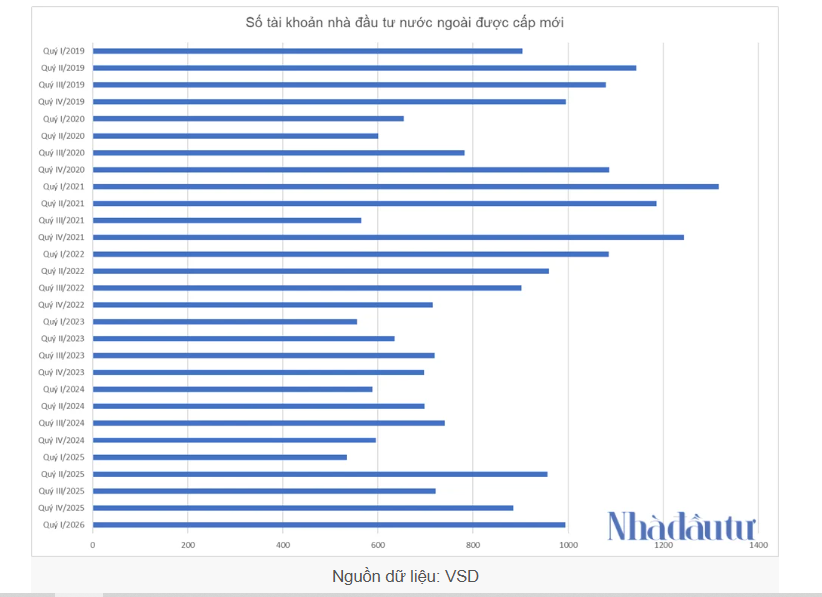 Số liệu của Nhadautu.vn cho thấy, giai đoạn 2021 – 2022, khi thị trường chứng khoán Việt Nam bùng nổ, VN-Index tăng từ vùng 660 điểm lên 1.500 điểm, cũng ghi nhận số lượng tài khoản nhà đầu tư nước ngoài mở mới tăng mạnh, vượt 1.000 tài khoản mỗi quý.