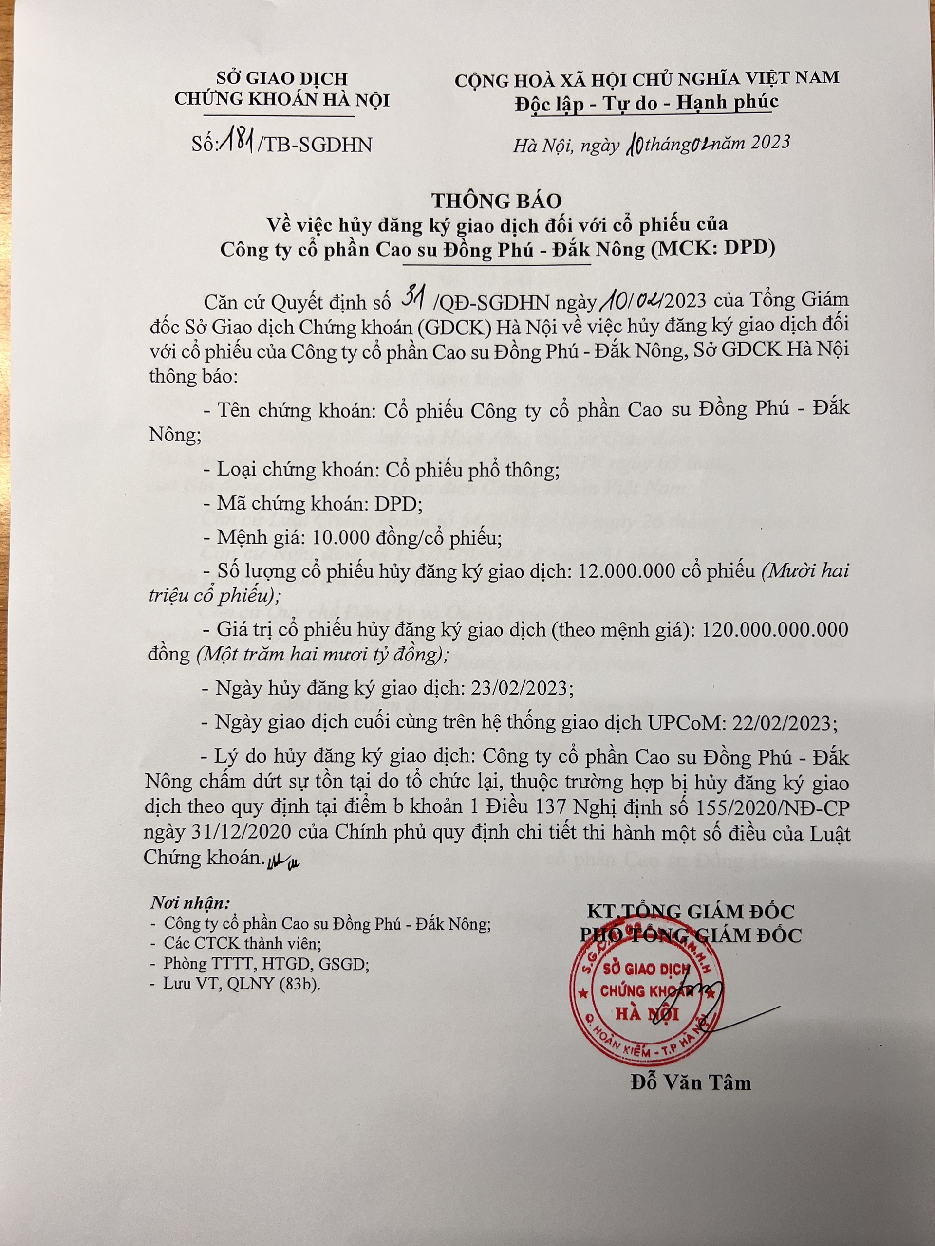 DPD: Ngày 23/02/2023, ngày hủy ĐKGD cổ phiếu của CTCP Cao su Đồng Phú - ĐắK Nông
