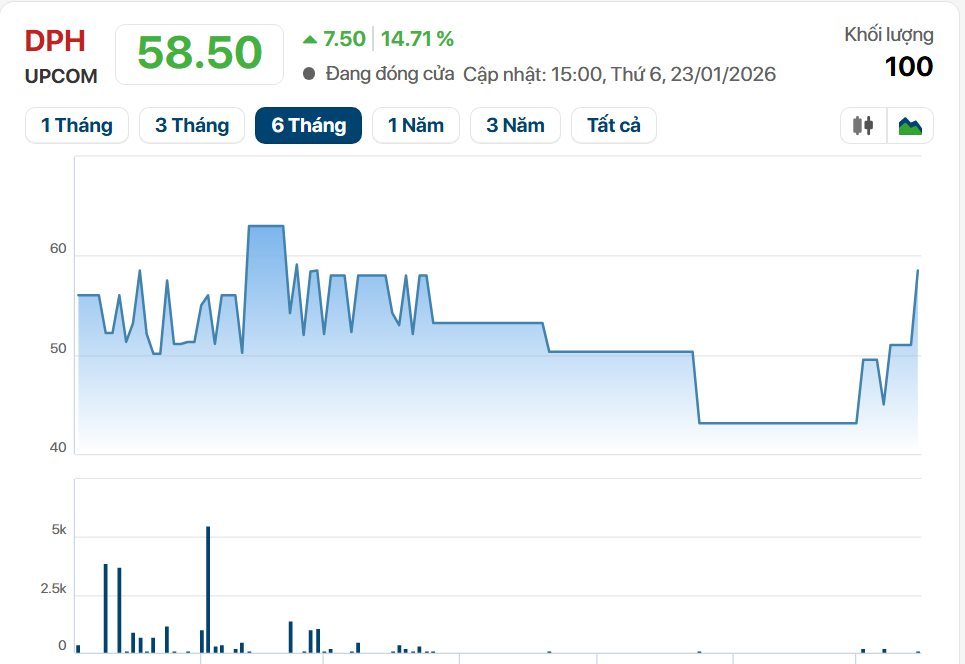 Thông tin tích cực về cổ tức ngay lập tức phản ánh vào diễn biến giá cổ phiếu trên thị trường. Kết thúc phiên giao dịch ngày 23/01/2026, mã DPH ghi nhận mức tăng 7.500 đồng, tương ứng biên độ 14,71%, đóng cửa tại mức giá trần 58.500 đồng/cổ phiếu.