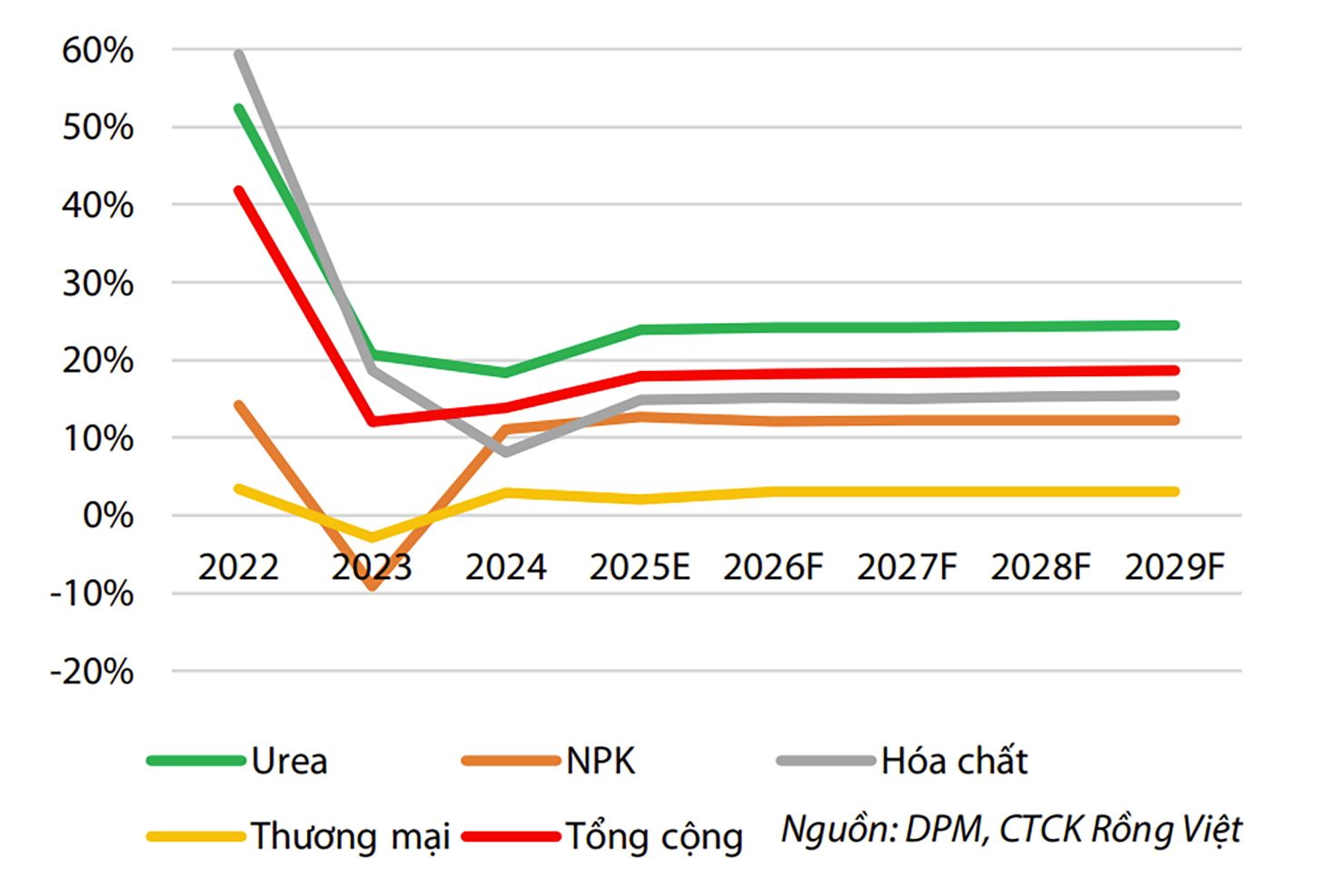 Tuy nhiên, DSC lưu ý trong quý 4/2025, DPM có thể chịu ảnh hưởng do mưa bão, lũ lụt và bảo trì nhà máy. Sản lượng Ure và NPK cuối năm nay có thể giảm so với cùng kỳ năm ngoái. Riêng sản lượng tiêu thụ nội địa Ure có thể giảm tới 19%, chủ yếu do nhu cầu trong nước chững lại dưới tác động của mưa lớn và tình trạng ngập lụt tại khu vực Nam Trung Bộ và Tây Nguyên. Nhiều khả năng kết quả kinh doanh quý 4/2025 của DPM sẽ bị ảnh hưởng bởi hoạt động gieo trồng dự kiến diễn ra muộn hơn do mưa bão. Do đó, doanh thu và lợi nhuận quý 4/2025 của DPM có thể khó đạt được mục tiêu.