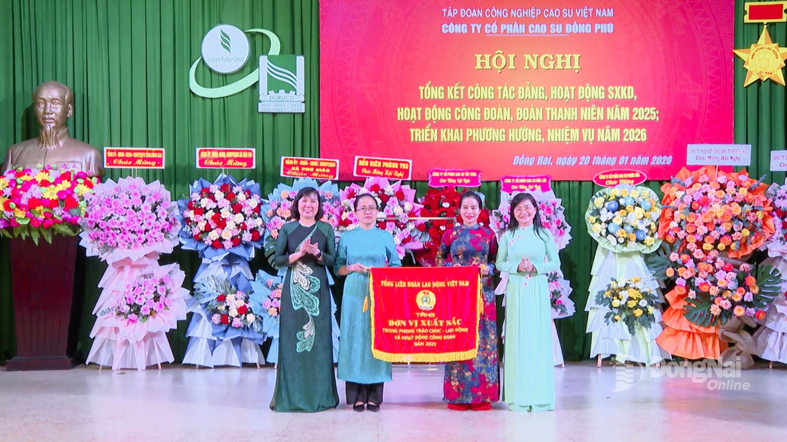 Lãnh đạo Liên đoàn Lao động tỉnh Đồng Nai và Công đoàn Cao su Việt Nam trao Cờ thi đua của Tổng Liên đoàn Lao động Việt Nam cho Công đoàn Công ty cổ phần Cao su Đồng Phú. Ảnh: Tấn Tài