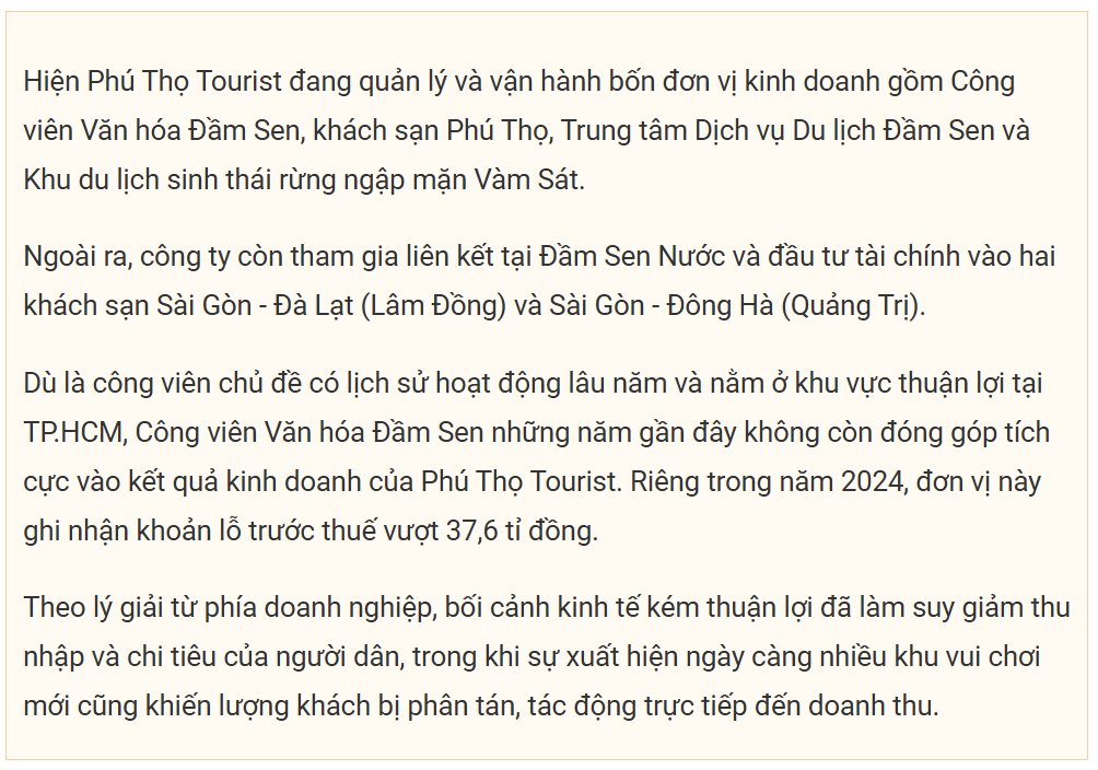 Phú Thọ Tourist, đơn vị quản lý Công viên Văn hóa Đầm Sen, ghi nhận khoản lỗ lên tới 55 tỉ đồng do doanh thu sụt giảm trong khi chi phí duy trì hoạt động vẫn ở mức lớn.