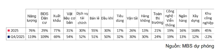 Dự báo tăng trưởng lợi nhuận quý IV/2025 và cả 2025 của các nhóm ngành. Nguồn: MBS.