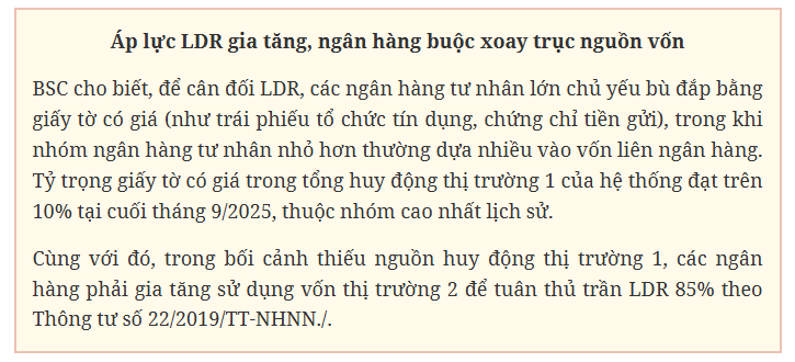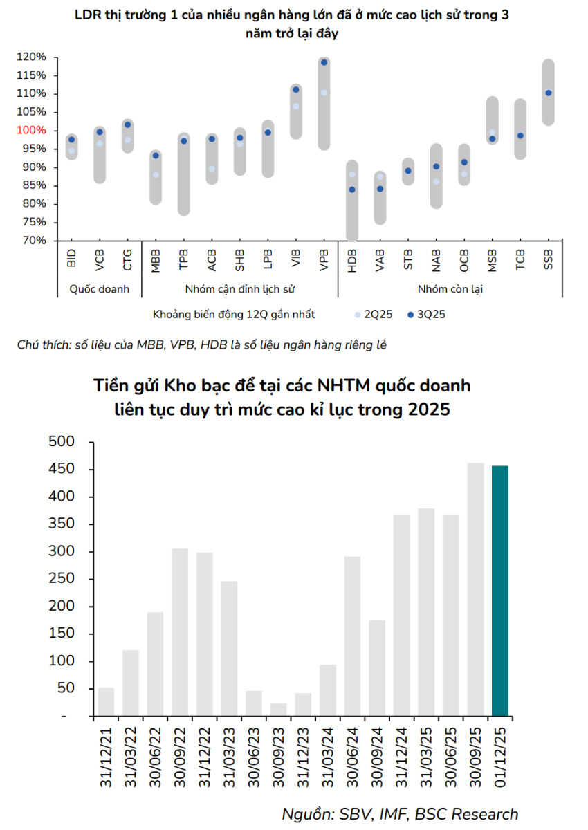 Xét trên góc độ toàn hệ thống, BSC cho rằng, hệ số LDR thị trường 1 ước đạt gần 99% vào cuối tháng 9/2025. Riêng tỷ lệ tín dụng/huy động tiền gửi đã lên khoảng 110%, khi huy động chỉ tăng 12% đến cuối tháng 11/2025, thấp hơn đáng kể so với mức tăng trên 16% của tín dụng.