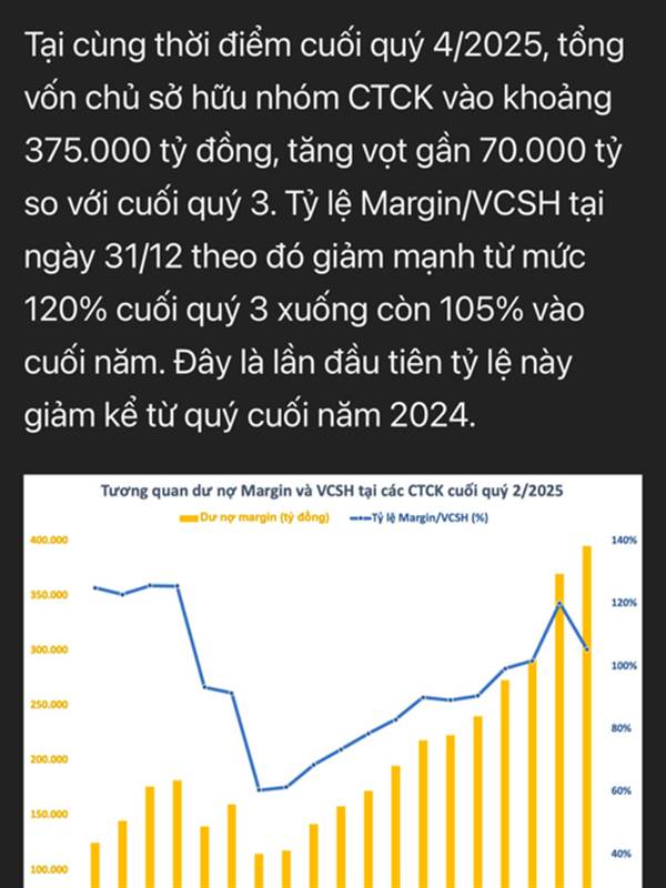 Tại cùng thời điểm cuối quý 4/2025, tổng vốn chủ sở hữu nhóm CTCK vào khoảng 375.000 tỷ đồng, tăng vọt gần 70.000 tỷ so với cuối quý 3. Tỷ lệ Margin/VCSH tại ngày 31/12 theo đó giảm mạnh từ mức 120% cuối quý 3 xuống còn 105% vào cuối năm. Đây là lần đầu tiên tỷ lệ này giảm kể từ quý cuối năm 2024.