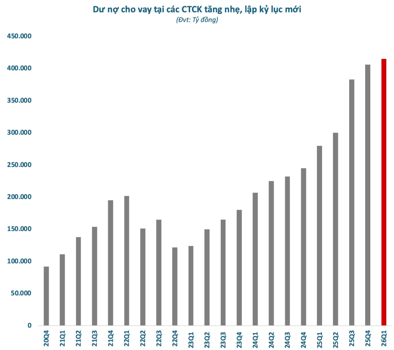 Theo thống kê, tính đến cuối quý 1/2026, dư nợ cho vay (bao gồm margin và ứng trước tiền bán) tại các công ty chứng khoán ước tính vào khoảng 415.000 tỷ đồng, tăng khoảng 9.000 tỷ so với cuối năm 2025 trước đó và là mức cao kỷ lục từ trước đến nay.