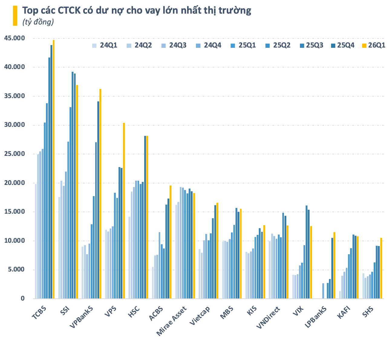 Tính đến cuối quý 1, toàn thị trường ghi nhận 15 CTCK có dư nợ cho vay trên 10.000 tỷ đồng, trong đó 5 cái tên là TCBS, SSI, VPBankS, VPS và HSC là những CTCK có dư nợ trên 1 tỷ USD. TCBS tiếp tục là là CTCK có dư nợ cho vay lớn nhất toàn ngành với giá trị gần 45.000 tỷ, tăng nhẹ so với đầu năm.