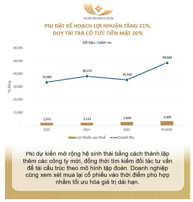 Năm 2026, HĐQT PNJ đề xuất kế hoạch kinh doanh năm 2026 với doanh thu 48.660 tỷ đồng và lợi nhuận sau thuế 3.409 tỷ đồng, lần lượt tăng 37%và 21% so với thực hiện năm 2025. Nếu hoàn thành kế hoạch đề ra, PNJ sẽ có năm thứ 5 liên tiếp tăng trưởng lợi nhuận. Doanh nghiệp cũng dự kiến tiếp tục duy trì chính sách chi trả cổ tức tiền mặt ở mức 20%.