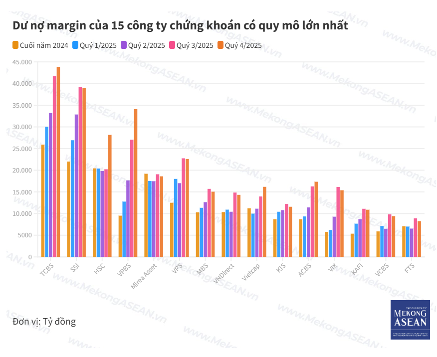 TCBS hiện đứng đầu về dư nợ margin với hơn 43.000 tỷ đồng, theo sau là SSI với gần 39.000 tỷ đồng và VPBankS với gần 34.000 tỷ đồng. Hai cái tên khác ghi nhận dư nợ vượt mốc 20.000 tỷ đồng là HSC và VPS. Nhóm 10 công ty lớn nhất còn có sự hiện diện của Mirae Asset, ACBS, Vietcap, VIX và VNDirect.