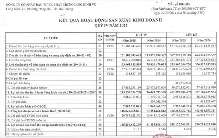 Tính lũy kế cả năm 2025, Cảng Đình Vũ ghi nhận doanh thu thuần 587,2 tỷ đồng, giảm 15% so với cùng kỳ. Lợi nhuận sau thuế đạt 338,1 tỷ đồng, gần như đi ngang so với cùng kỳ năm ngoái.