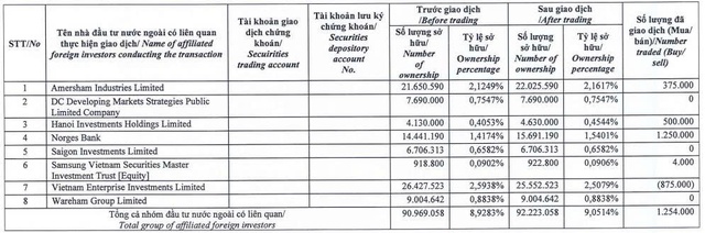 Cụ thể, quỹ Amersham Industries Limited mua vào 375.000 cổ phiếu; quỹ Hanoi Investments Holdings Limited mua 500.000 cổ phiếu; quỹ Norges Bank mua 1,25 triệu cổ phiếu và quỹ Samsung Vietnam Securities Master Investment Trust [Equity] mua 4.000 cổ phiếu.