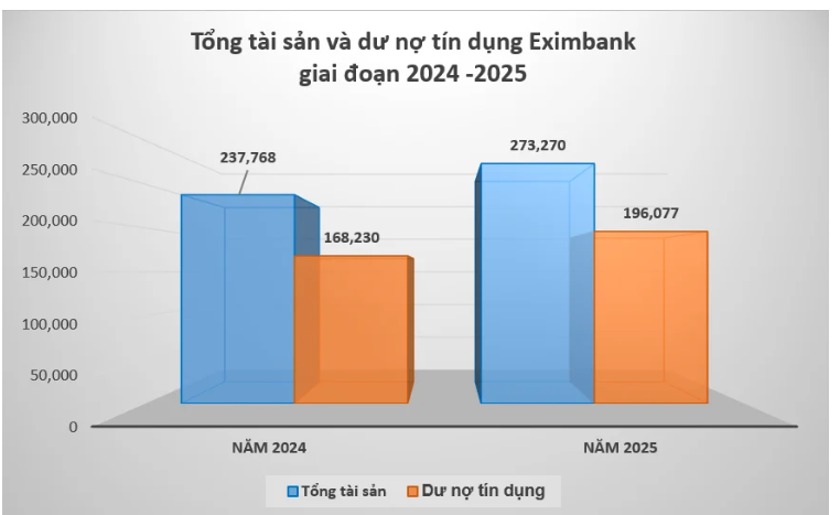 Tăng trưởng tín dụng và tổng tài sản Eximbank giai đoạn 2024 - 2025.