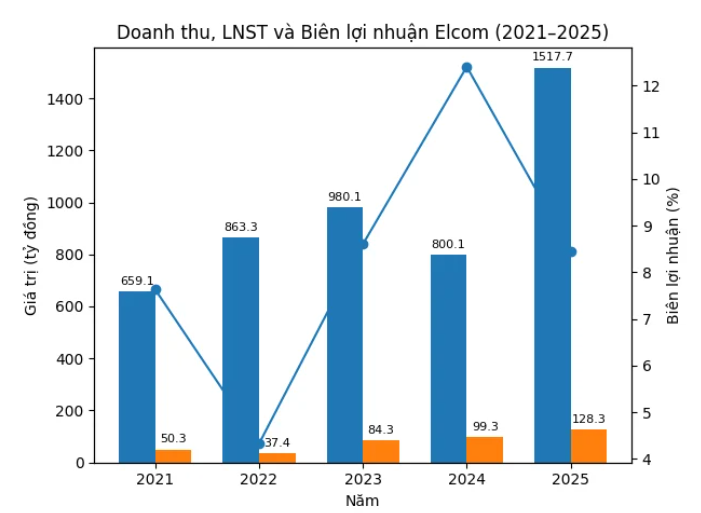 Năm 2025, Elcom ghi nhận doanh thu 1.517 tỷ đồng – mức cao nhất kể từ khi thành lập. Đây cũng mới là lần thứ hai doanh nghiệp vượt mốc 1.000 tỷ đồng doanh thu, sau lần đầu vào năm 2016.