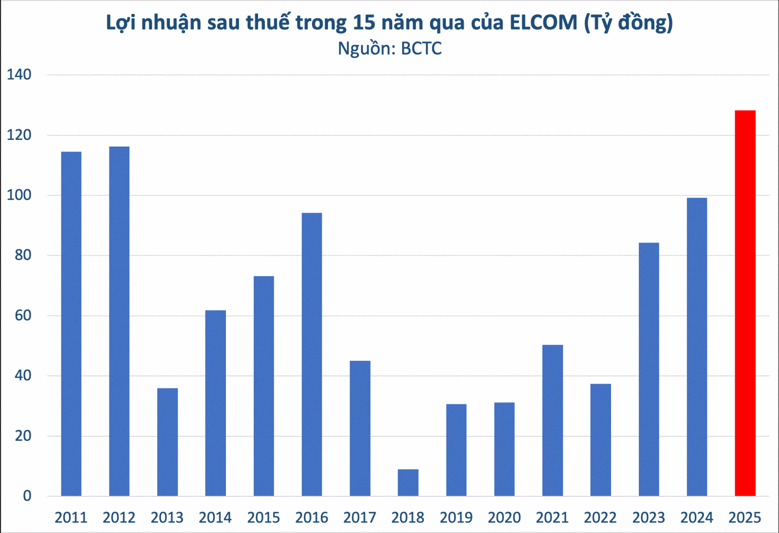 Ước tính kết quả kinh doanh năm 2025, ELCOM ghi nhận doanh thu thuần về bán hàng và cung cấp dịch vụ gần 1.518 tỷ đồng, gần gấp đôi mức 800 tỷ đồng năm ngoái. Nhờ kiểm soát chi phí, ELCOM ghi nhận lợi nhuận sau thuế cả năm đạt hơn 128 tỷ đồng, tăng trưởng 29,3% so với 2024. Với kết quả này, ELCOM nối dài chuỗi năm tăng trưởng lợi nhuận lên 4 năm liên tiếp.