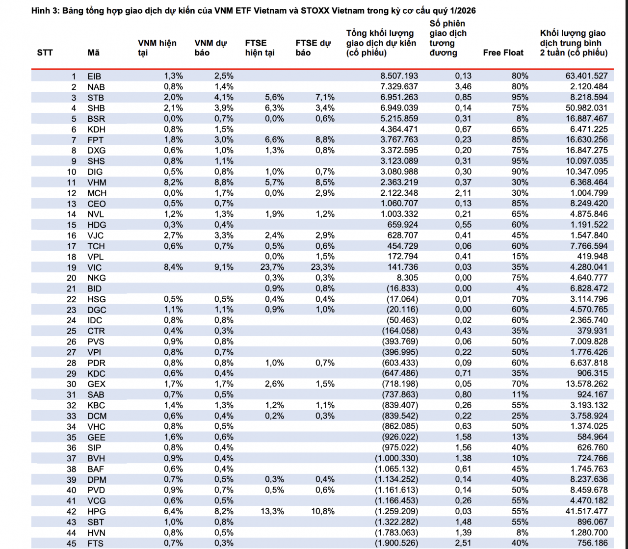 Ngoài các diễn biến dòng vốn trong ngắn hạn, MBS cũng đưa ra dự báo liên quan đến kỳ cơ cấu danh mục quý I/2026 của hai quỹ chỉ số lớn là STOXX Vietnam ETF (trước đây theo dõi FTSE Vietnam Index) và MarketVector Vietnam Local Index ETF (VNM ETF).