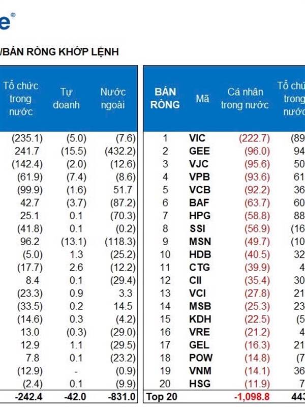 + Top BÁN ròng : VIC, VRE, FPT